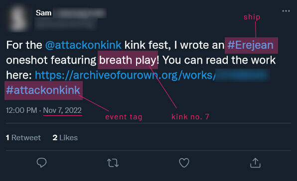 We kindly ask you to share your works on Twitter using our event hashtag #attackonkink. If you don’t have Twitter, you can also send us a link to your creation on the Attack on Writing discord server.If you publish your works on AO3, please add them to the event collection.If we didn’t retweet or share your work: